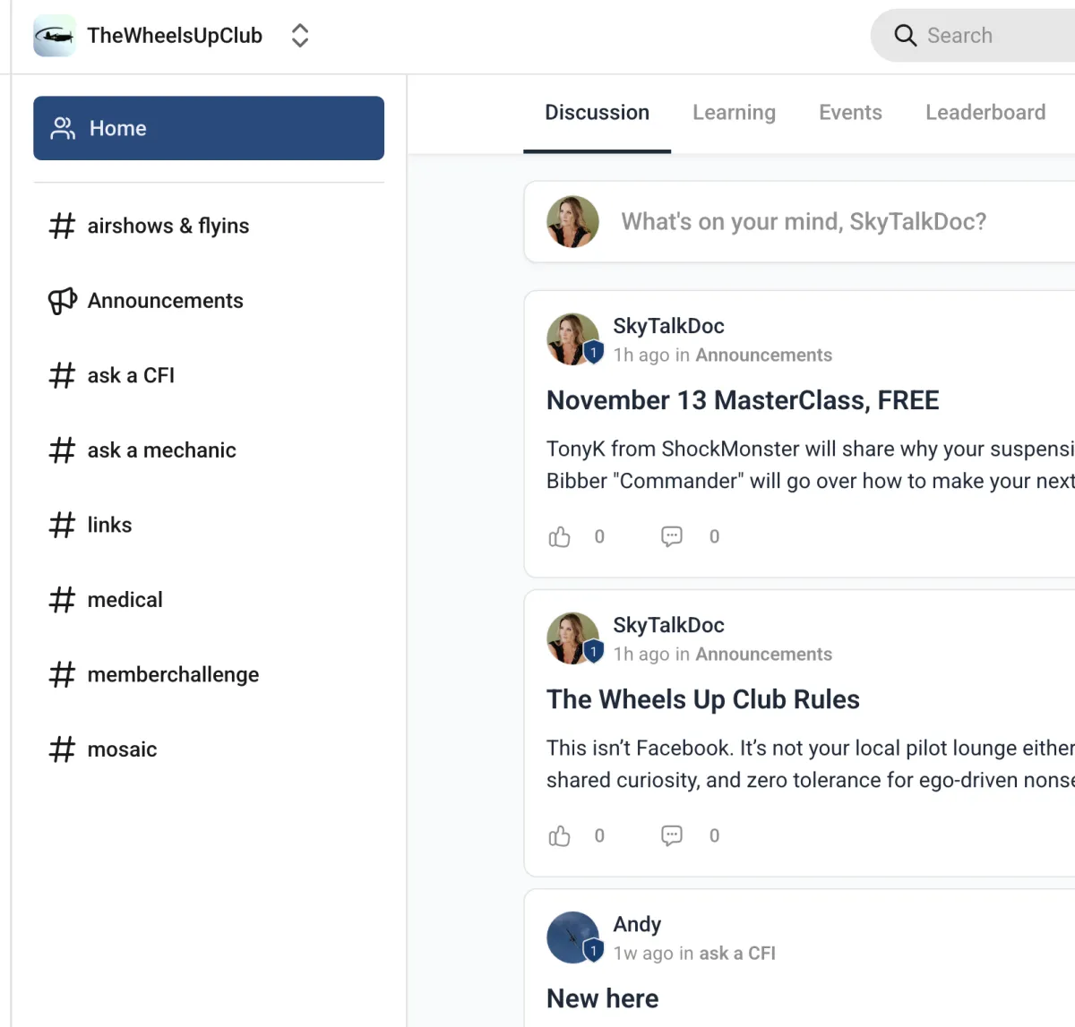 Yes. It runs like Skool — discussion-based with channels like Ask-a-CFI and Ask-a-Mechanic so you get answers, not noise.